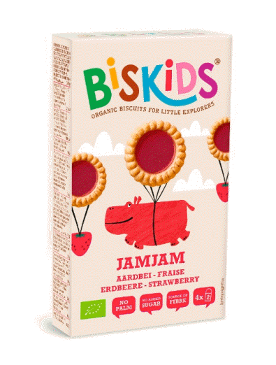 Discover Biskids JAMJAM: a delicious organic biscuit with a soft strawberry filling, specially developed for children. Free from palm oil, with no added sugars, and rich in fiber, perfect for a responsible snack. Each portion is playfully packed and ideal for on the go or in the lunchbox. Let children enjoy a tasty, playful treat that parents can feel good about!