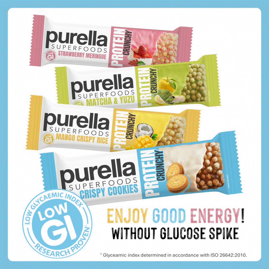 Discover our line of CRUNCHY PROTEIN BARS, designed for those looking for a light, crunchy texture in every bite. These bars combine high-quality protein, superfoods, and a colorful, flavored protein coating to deliver both great taste and balanced nutrition and LOW GLYCEAMIC INDEX, independently tested. Enjoy a satisfying crunch as you fuel your body and delight your senses.
